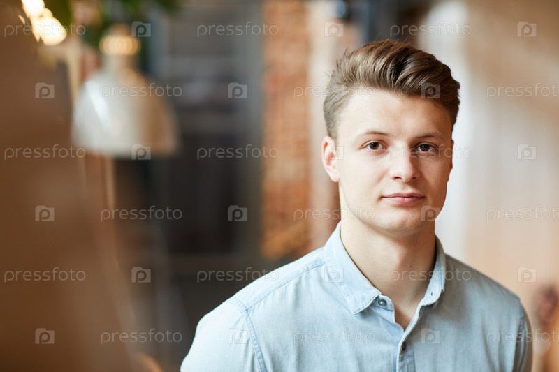 Портрет серьезного молодого успешного предпринимателя со стильной прической, стоящего в современном кафе