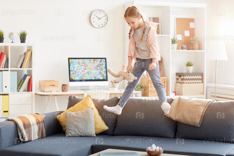 Игральная девушка прыгает на диване