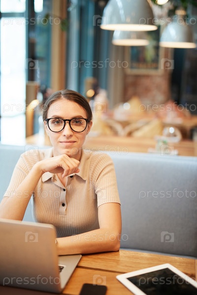 Портрет улыбающейся привлекательной молодой женщины в очках, сидящей за столом с ноутбуком во время работы в уютном кафе