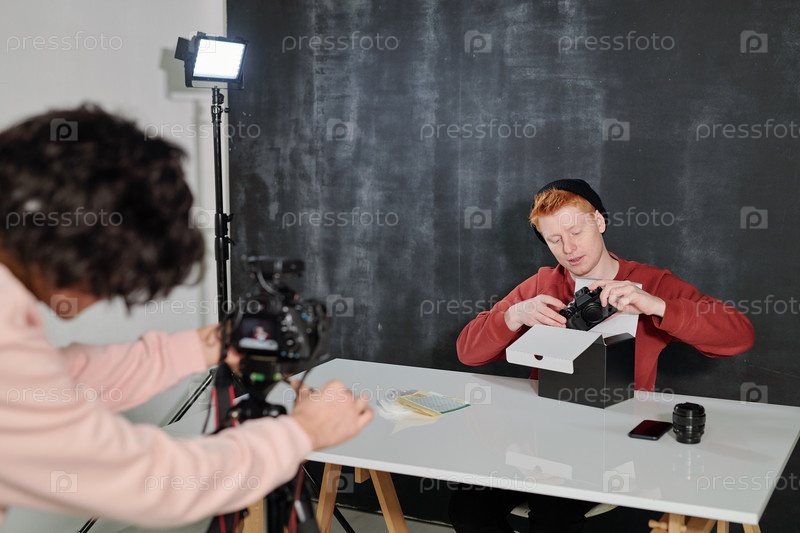 Молодой оператор снимает влоггера, распаковывая коробку и вынимая новый фотоаппарат