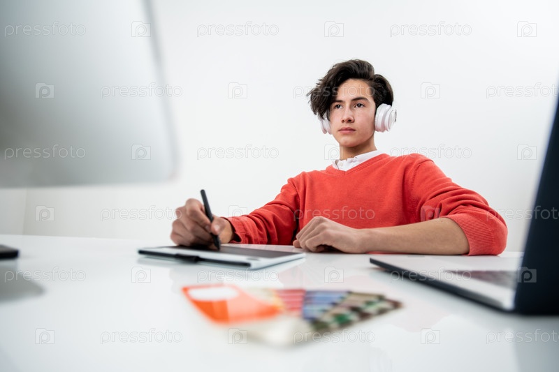 Молодой серьезный веб-дизайнер в наушниках, выполняющий работу по ретушированию на столе