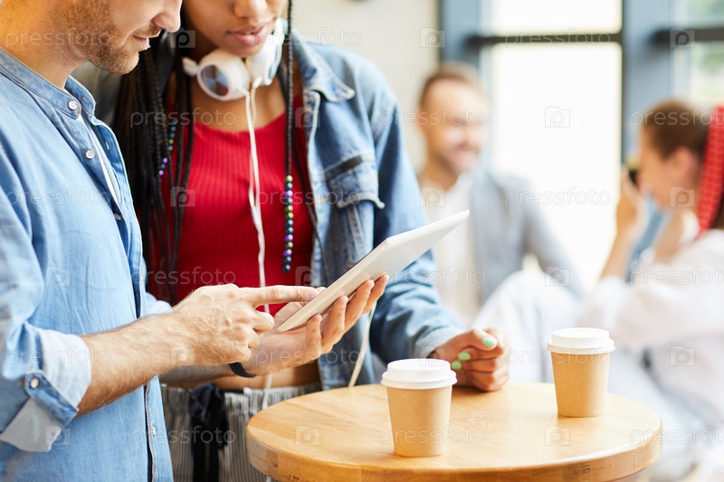 Близкий план молодых межрасовых друзей в повседневных нарядах, стоящих за высоким столом и использующих планшет во время обсуждения веб-сайта