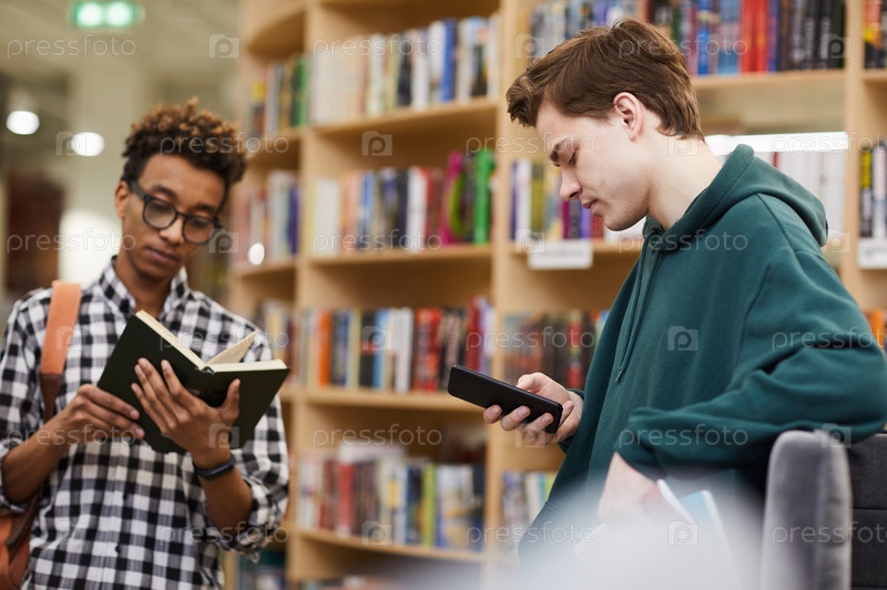 Молодые мальчики-студенты выбирают литературу в библиотеке