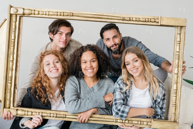 Группа молодых межкультурных веселых друзей в повседневной одежде смотрит на тебя
