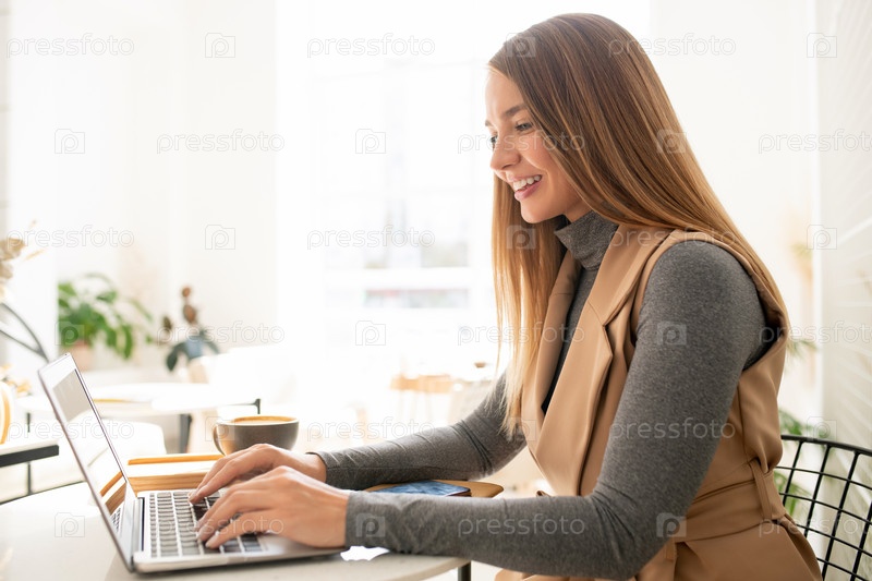 Молодая жизнерадостная деловая женщина сидит за столом в кафе перед ноутбуком