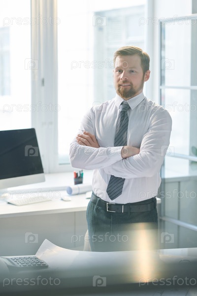 Улыбающийся уверенный красивый молодой бизнесмен в формальной одежде стоит за столом и скрещивает руки на груди, отворачиваясь и планируя новый проект