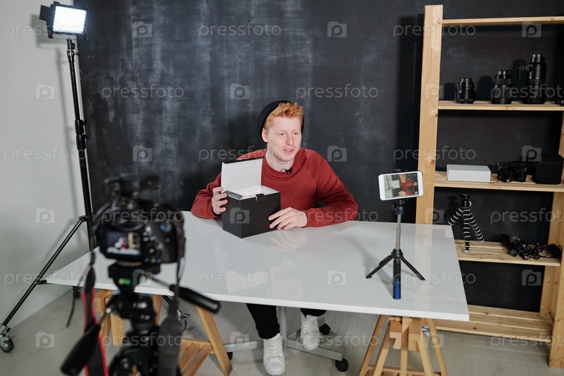 Молодой современный мужской влоггер собирается распаковать коробку с новым фотоаппаратом