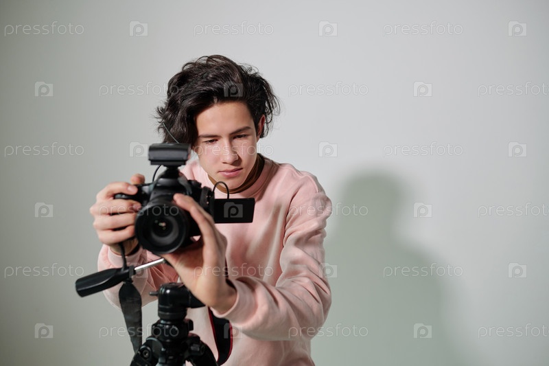 Молодой оператор в порошкообразной розовой футболке регулирует видеооборудование