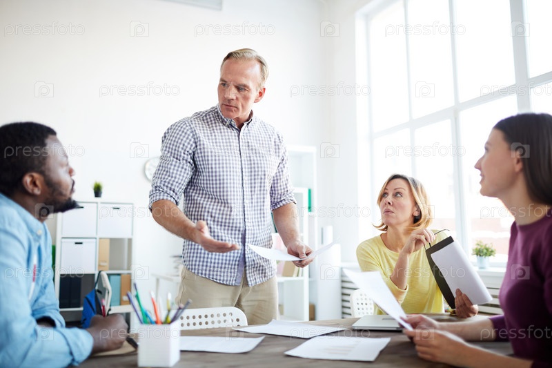 Серьезный уверенный бизнес-лидер в непринужденной рубашке, стоящий за столом заседаний и объясняющий свою позицию во время работы с командой
