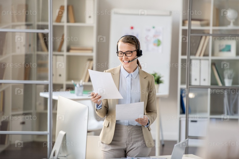 Дама рассматривает документы, разговаривая с клиентом