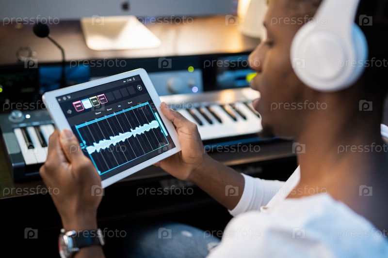 Афроамериканский молодой человек с наушниками, держащий планшет со звуковыми волнообразованиями