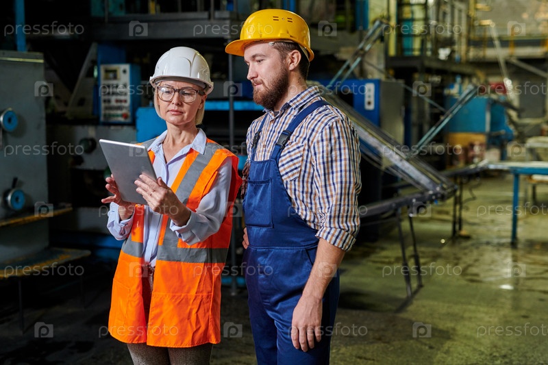 Серьезные мыслящие инженеры в рабочих шлемах стоят в производственном цехе типографического завода и вместе анализируют 3D-модель на планшете