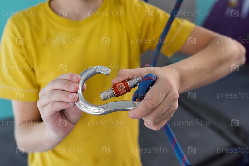 Активный школьник блокирует карабинер с толстой синей веревкой перед тренировкой