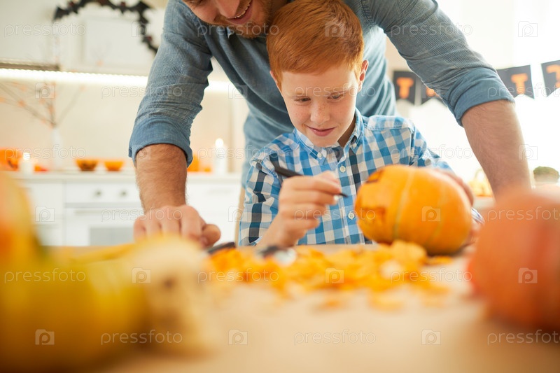 Маленький сын украшает тыкву
