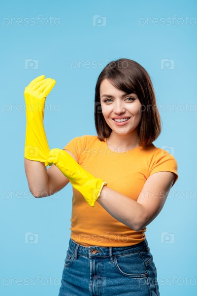 Уборщица или персонал уборной службы надевают желтые резиновые перчатки на руки