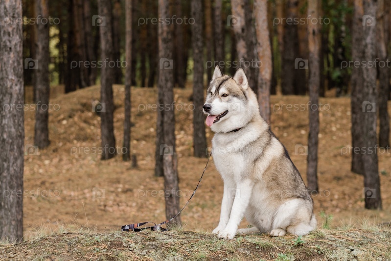 Милая пушистая чистокровная собака хаски с ошейником и поводком, сидящая в лесу