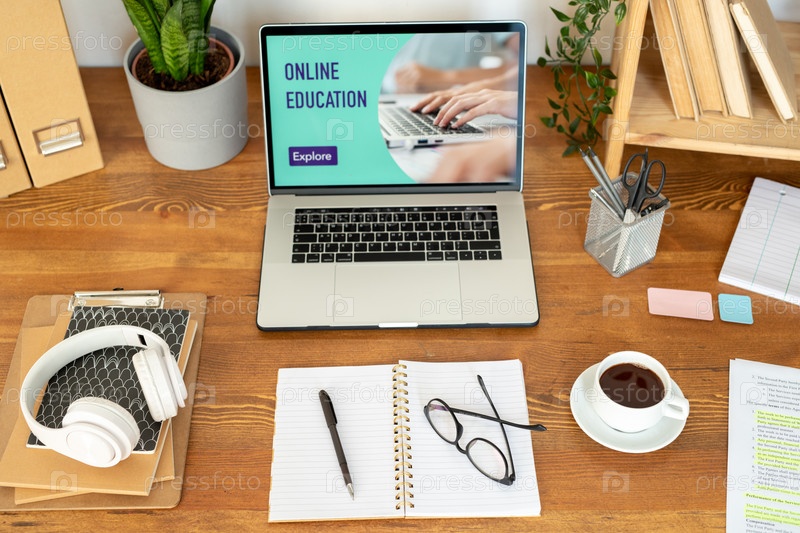 Ноутбук и другие канцелярские принадлежности и предметы на столе