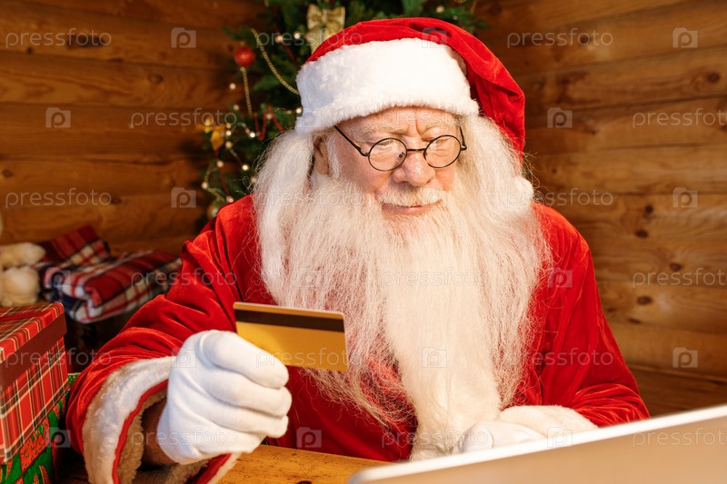 Мобильный Санта с пластиковой картой смотрит на дисплей ноутбука во время покупок в Интернете