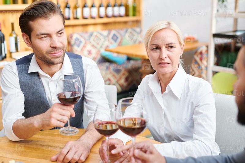 Группа коллег в формальной одежде обсуждает качество красного вина