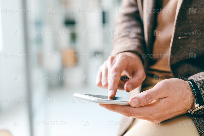 Руки молодого элегантного бизнесмена, указывающего на экран смартфона