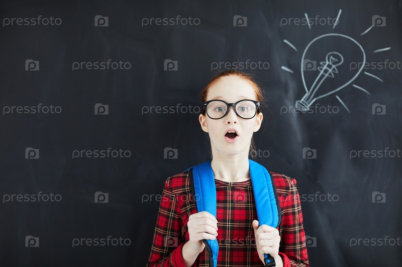 Веселая шокированная школьница в очках стоит на доске с рисунком лампочки и держит рот открытым, имея блестящую идею