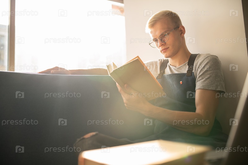 Серьезная молодая официантка кафе или ресторана в рабочей одежде смотрит на страницу книги