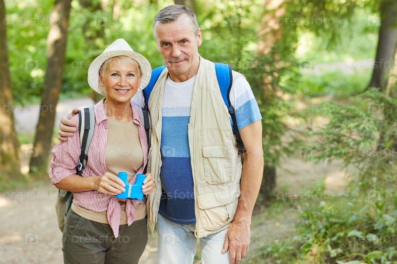 Пожилая пара путешественников стоит на улице