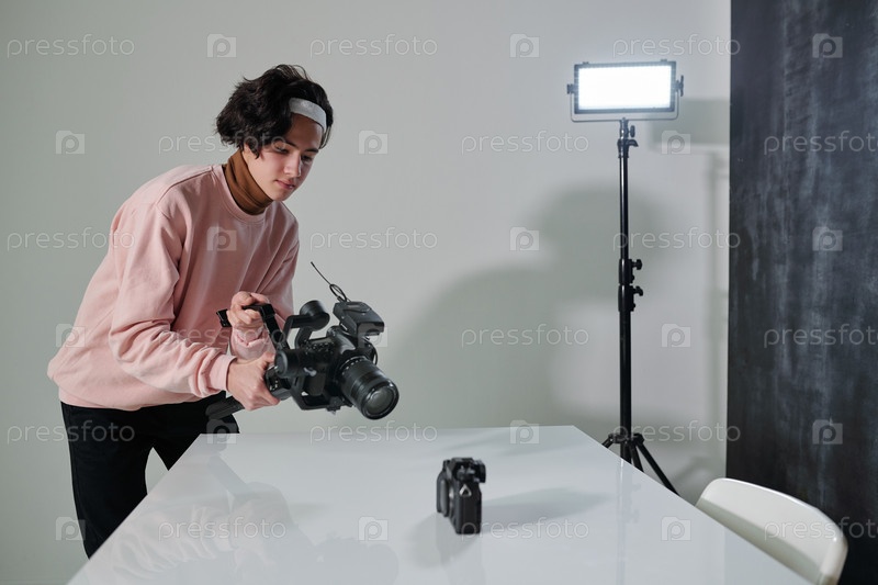 Современный мужской влогер с видеокамерой, снимающий новое фотооборудование
