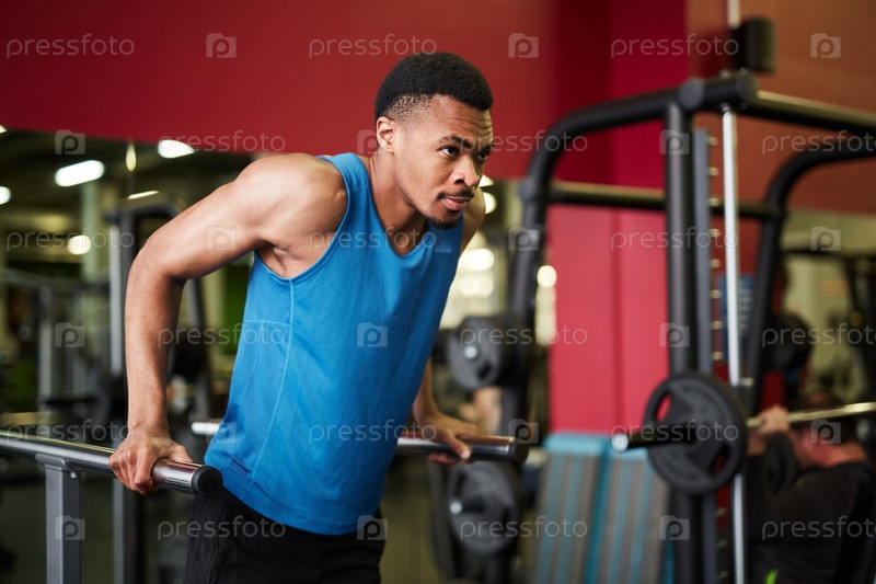Красивый афроамериканский мужчина тренируется в спортзале