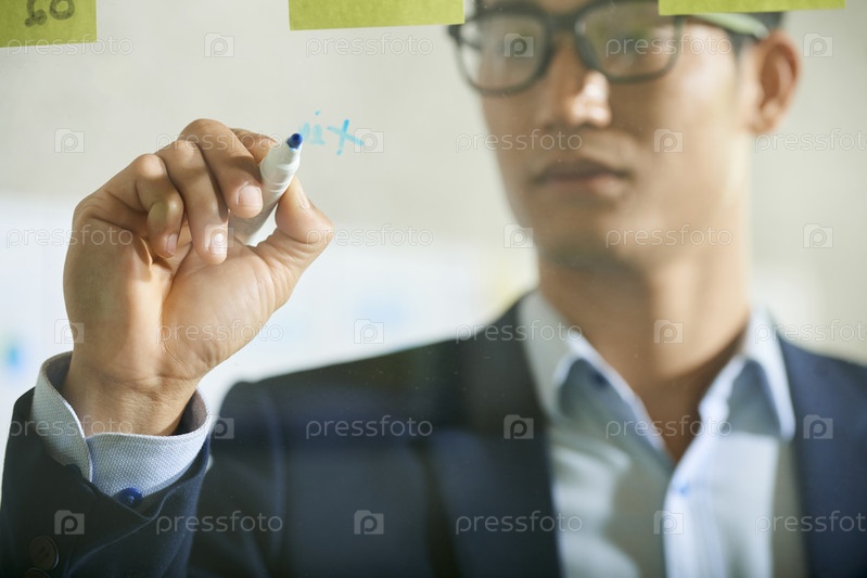 Бизнесмен пишет на стеклянной стене