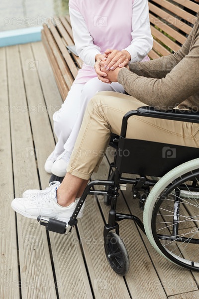 Непризнанная квалифицированная медсестра в форме сидит на скамейке снаружи и держит за руки инвалида в инвалидном кресле
