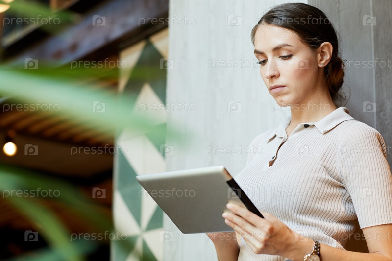 Серьезная заботливая молодая леди в бежевой рубашке стоит в коридоре космического коворкинга и использует планшет во время поиска информации
