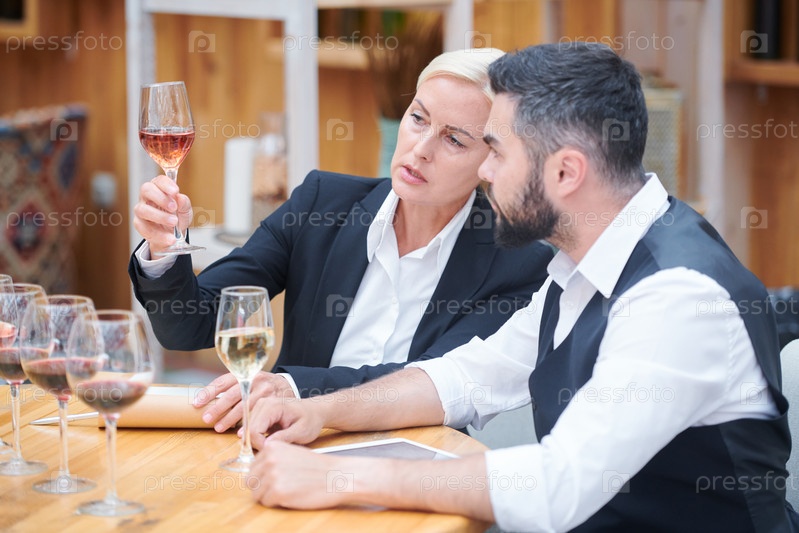 Красивый сомелье с бокалом белого вина дает его характеристики