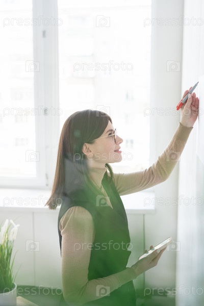 Молодая успешная бизнесвумен с смартфоном готовит презентацию