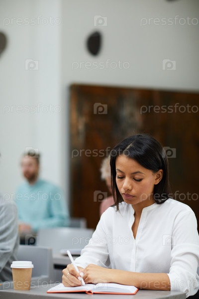 Бизнесвумен смешанной расы пишет в классе