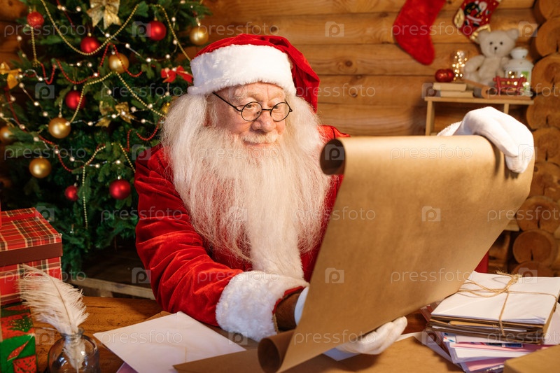 Санта в костюме разворачивает большую бумагу с рождественскими пожеланиями