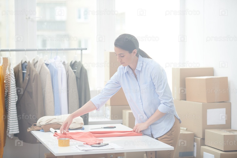 Молодой офисный менеджер интернет-магазина готовит повседневную одежду для одного из клиентов