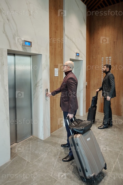 Один из бизнесменов с чемоданами нажимает кнопку вызова лифта в отеле