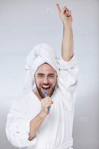 Забавный мужчина, поющий в зубную щётку