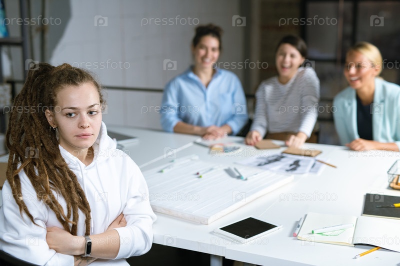 Молодая оскорбленная студентка или деловая женщина, страдающая от стонов своих друзей