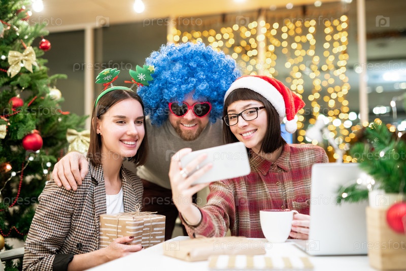 Группа счастливых коллег в рождественском наряде, делающих селфи по месту работы в офисе