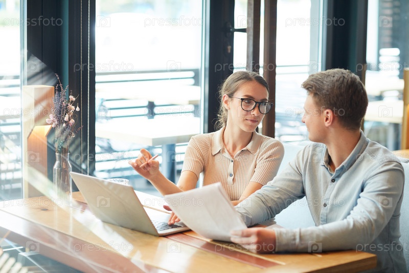 Вдумчивая привлекательная молодая женщина в очках сидит за столом в коворкинге и обсуждает план проекта с коллегой