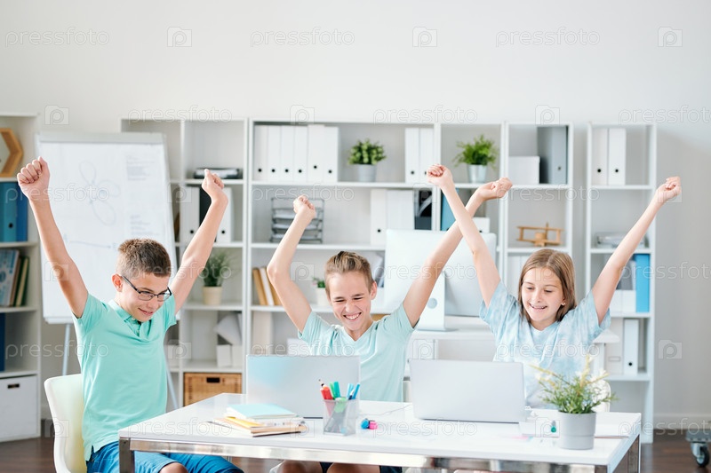 Трое успешных одноклассников держат руки поднятыми, выражая радость