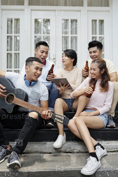 Молодые люди отдыхают на крыльце
