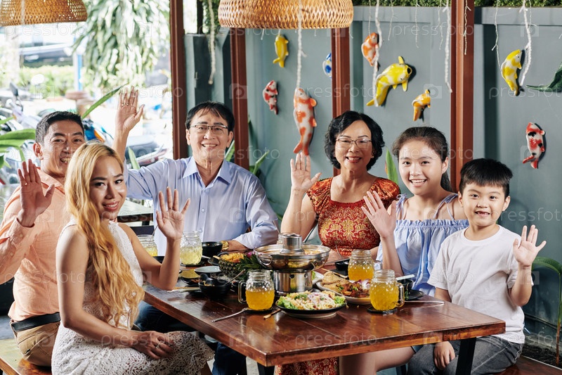 Счастливая семья машет руками