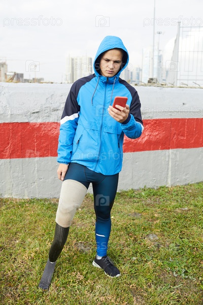 Серьезный молодой инвалид в куртке, носящий протез правой ноги, стоит на траве на свежем воздухе и отправляет смс-сообщения со смартфона
