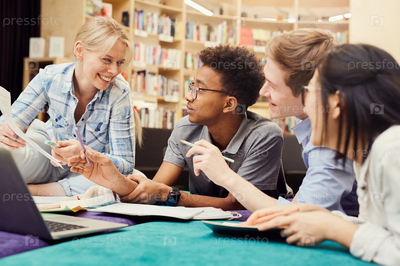 Группа веселых молодых студентов из разных этнических групп в непринужденной одежде, использующих ноутбук и учебники во время совместного выполнения домашних заданий в библиотеке