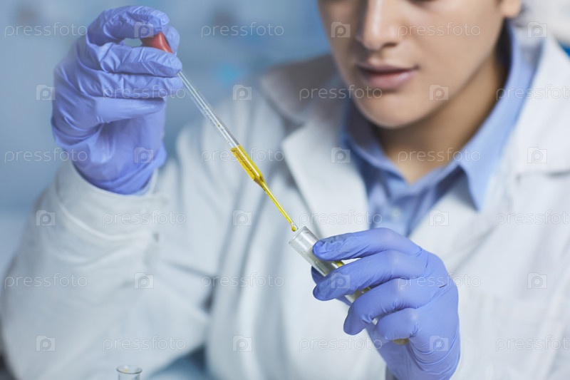 Близкий снимок сконцентрированной женщины-ученого в стерильных перчатках и лабораторном пальто, используя капельницу во время смешивания реагентов в пробирке медицинского образца