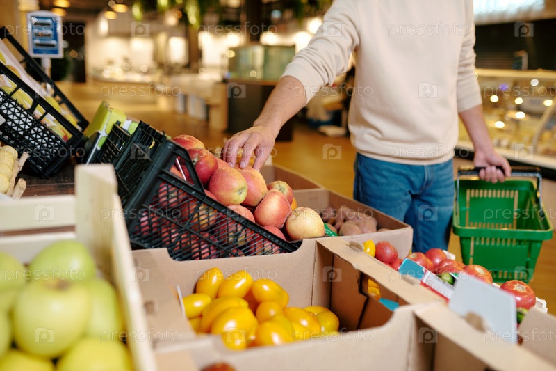 Молодой человек в повседневной одежде берет яблоко из деревянной коробки во время посещения супермаркета