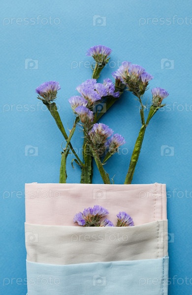 Близкий план милых голубых цветов, завернутых в салфетку и размещенных на подаваемом столе, концепция украшения